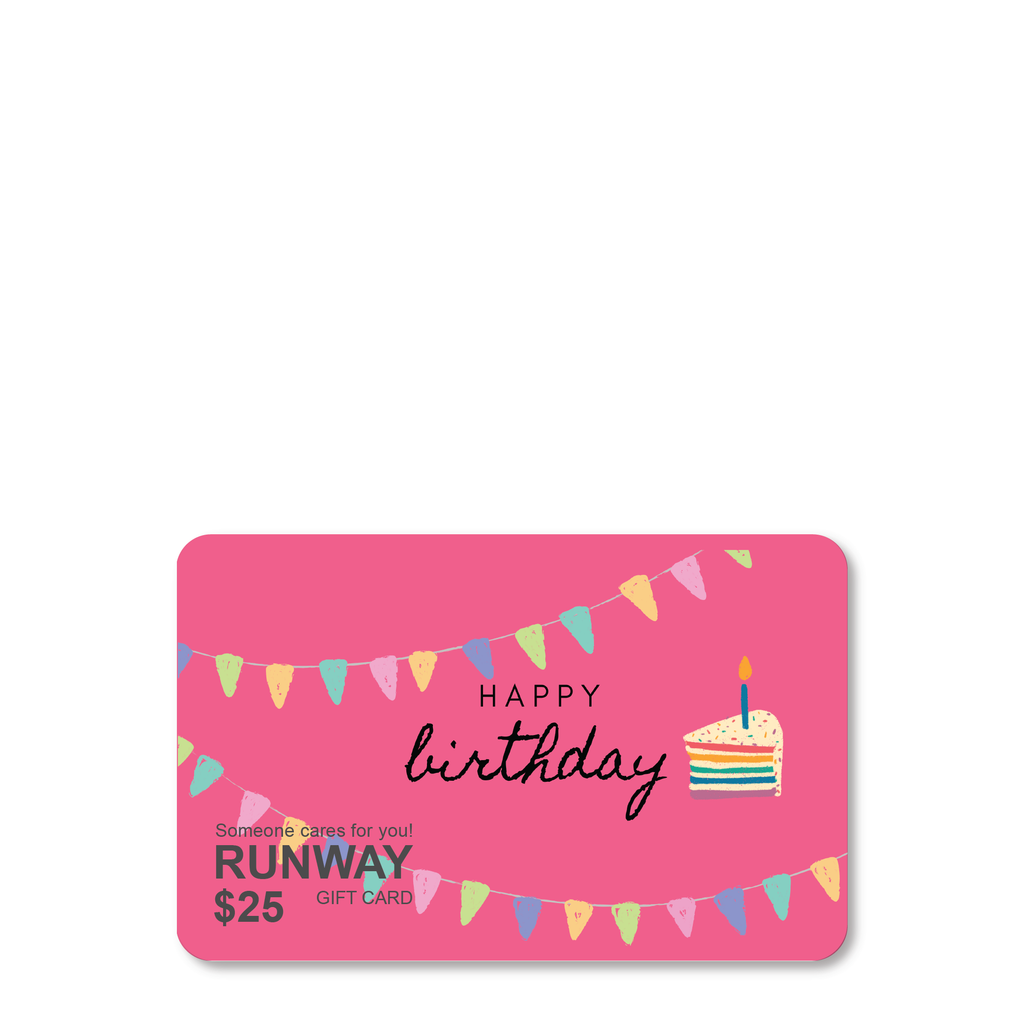 Our RUNWAY e-gift cards can have denominations of $25, $50, $100, $150, and $200. They are redeemable here on our Runway Supply website. Spoil someone you love today!